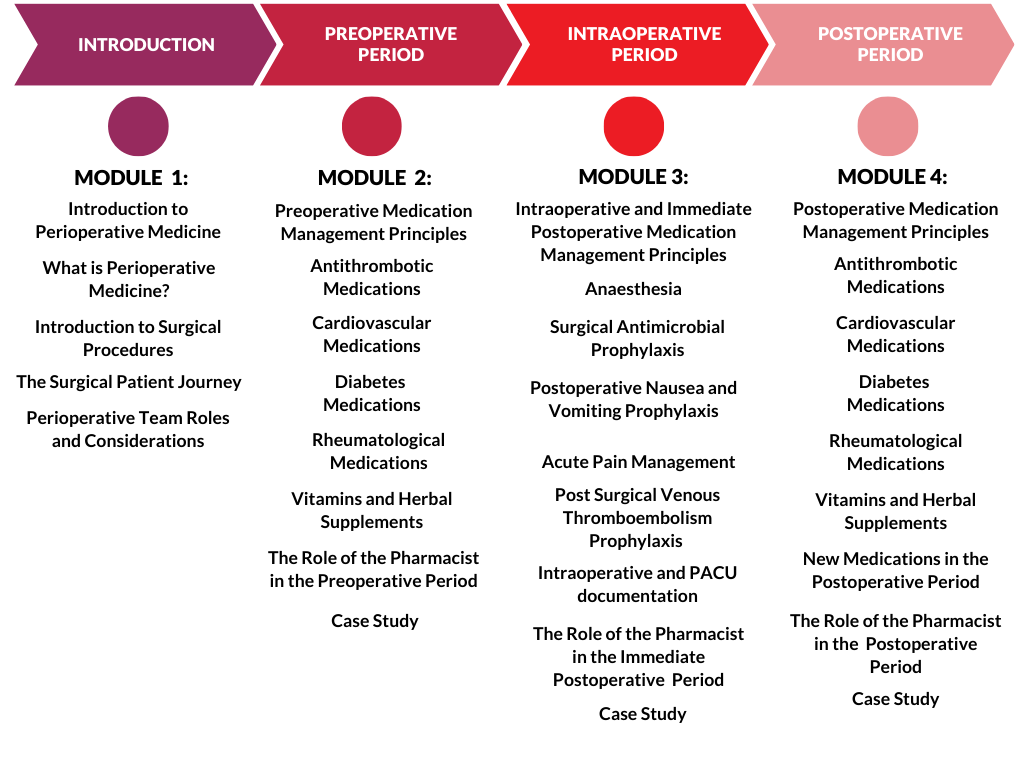 - Understanding of the pharmacist’s impact across the perioperative journey, from preoperative medication planning to intraoperative considerations then immediate postoperative management.